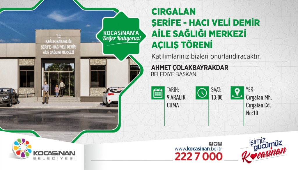 Kocasinan Belediyesi ve Hayırsever Hacı Veli Demir’in katkılarıyla üç ay gibi kısa bir sürede inşa edilerek, vatandaşın hizmetine sunulan Cırgalan Mahallesi’ndeki Şerife-Hacı Veli Demir Aile Sağlığı Merkezi’nin resmi açılışı gerçekleştirilecek. Vatandaşların yaşam kalitesini yükseltmek için dev sağlık yatırımlarını hayata geçirdiklerini ifade eden Kocasinan Belediye Başkanı Ahmet Çolakbayrakdar, 9 Aralık Cuma günü saat 13.00’te açılışı gerçekleştirilecek olan törene, tüm Kayserilileri davet etti.